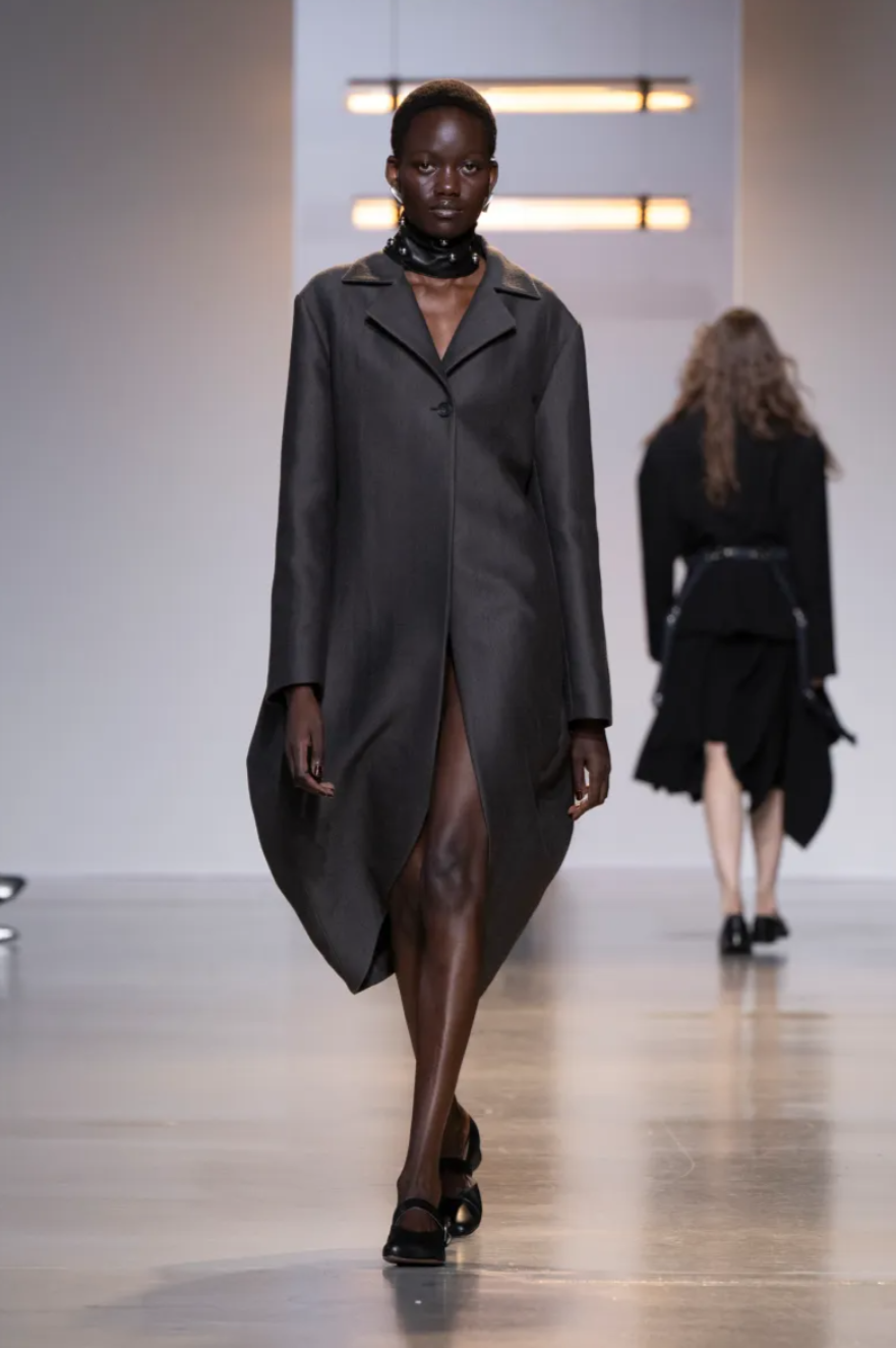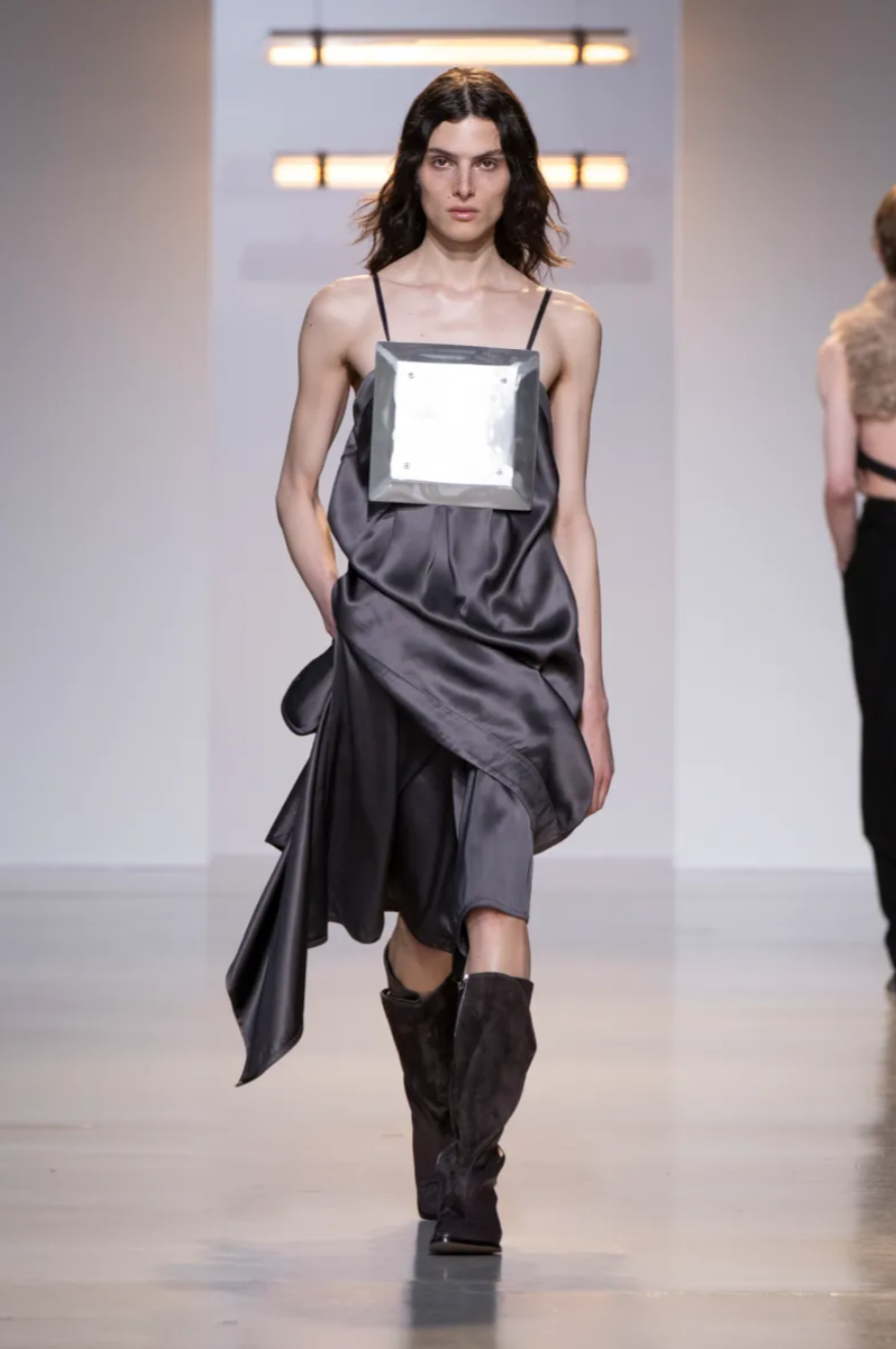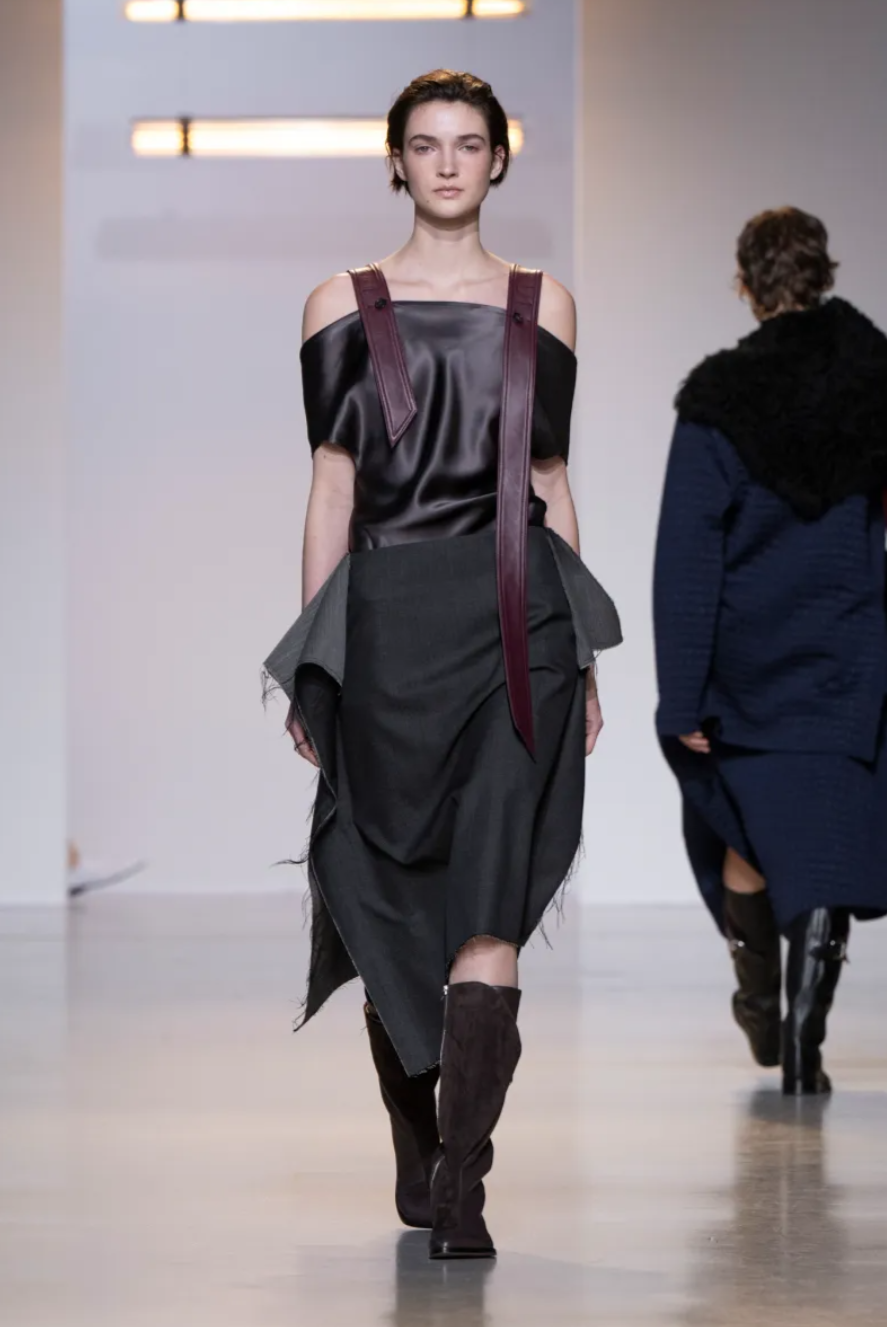 Silhouettes played with hybridity, a signature theme for the designer. Knitwear was layered in unexpected ways, including a one sleeve sweater draped over a crisp shirt so that the second sleeve hung forward like a scarf. Skirts and coats opened into inverted pleats at the back, creating cocoon like volumes that lifted away from the body. Men’s trousers were cut high at the waist and sliced at the knee to form pant skirt hybrids, while long skirts twisted and slit along the leg, dissolving the line between tailoring and drapery. Even the eveningwear followed this logic: sequined gowns in silver and pale peach shimmered with glamour, yet were paired with flat boots or brogues, grounding the look in something deliberately pragmatic. The result was a collection that felt both primal and precise, a reminder that Pasqualetti’s real subject is not clothing alone but the strange, shifting relationship between the body and the objects we place upon it.