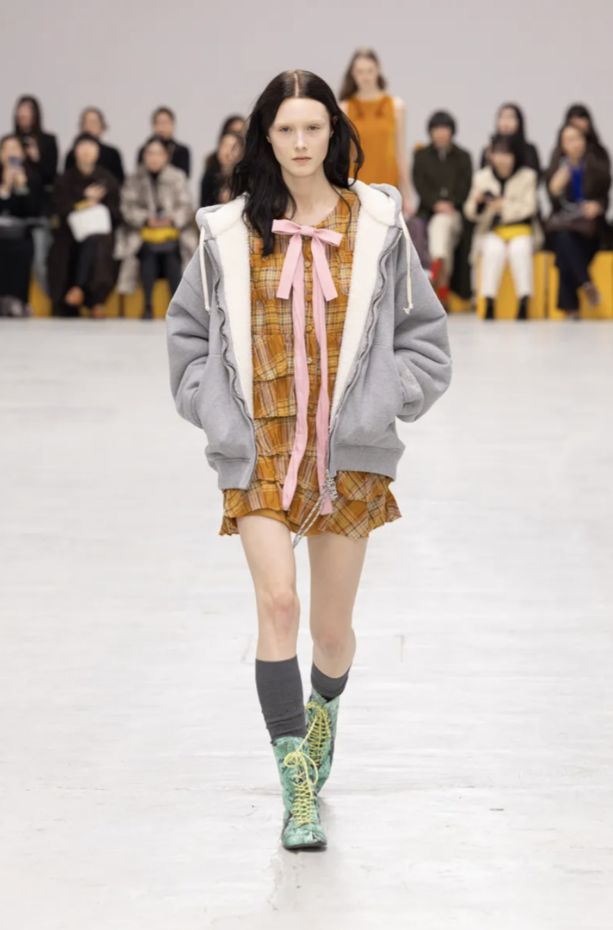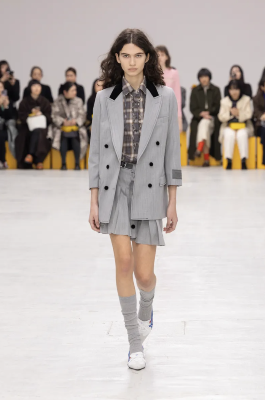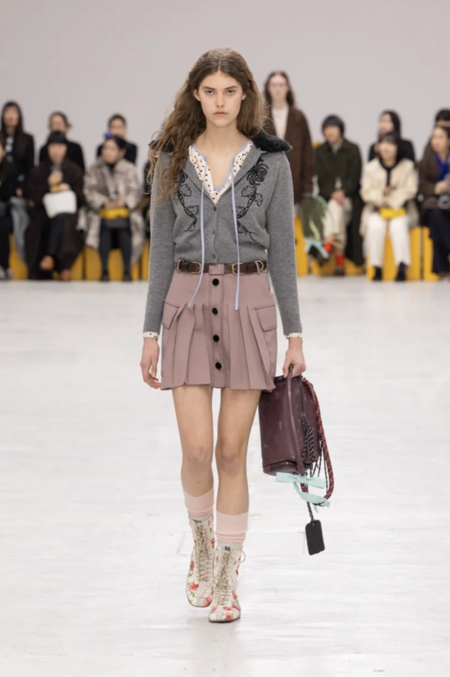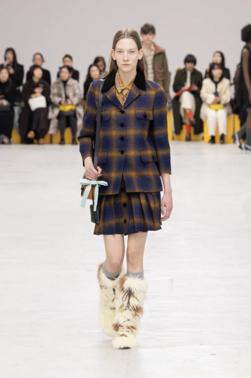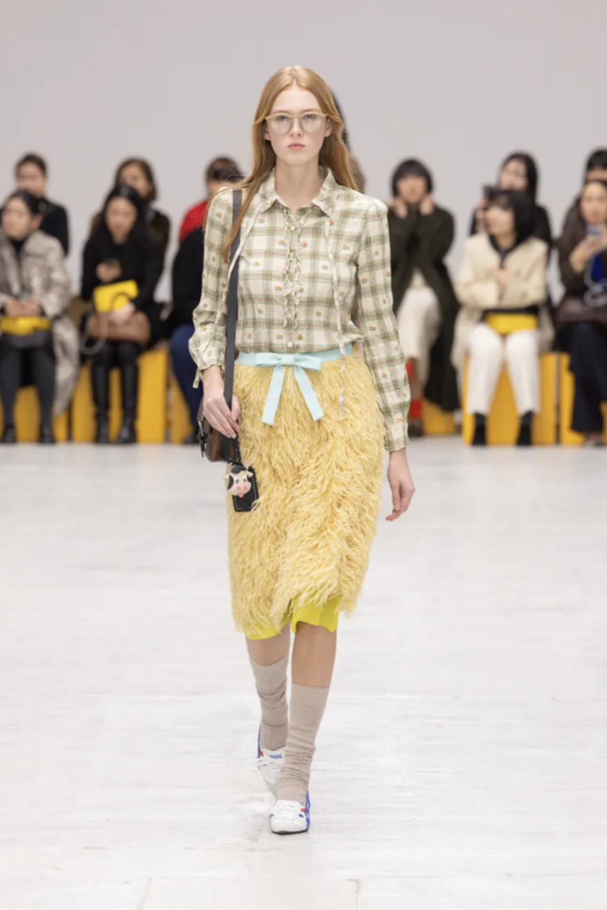 Schoolgirl Lolitas, eccentric professors, and skater boys mingled on the catwalk, all dressed in clothes that balanced precision and play. Pleated miniskirts and cropped blazers were styled with ribbed socks and pointy-toed kitten-heeled versions of the iconic Mexico 66 sneakers. Ruffled georgette blouses, sailor stripes, and pastel dresses brought a dose of sugary nostalgia, while fuzzy fleeces, checked shirts, and feathered skirts grounded the lineup in texture and practicality. The collection also introduced the Mexico 66 Square sneaker in lizard prints and floral motifs, as well as slingback heels and studded crossbody bags adorned with charms shaped like bows, lipstick holders, and tiny tigers.