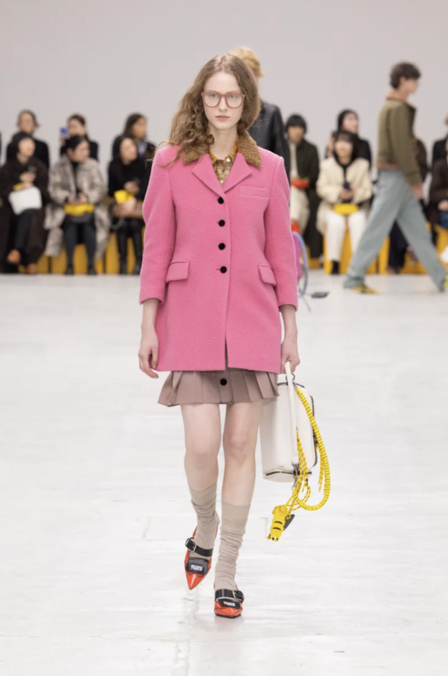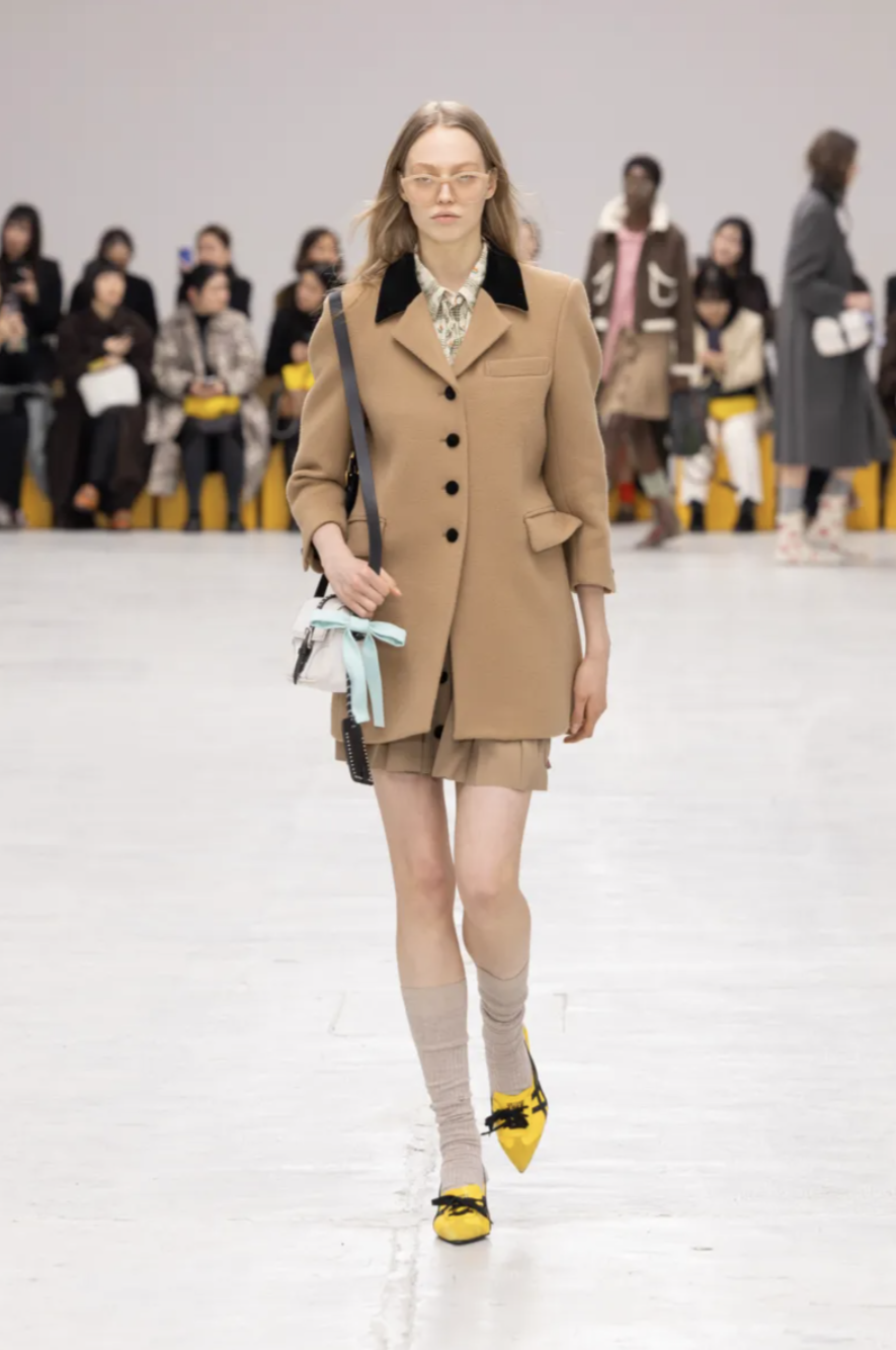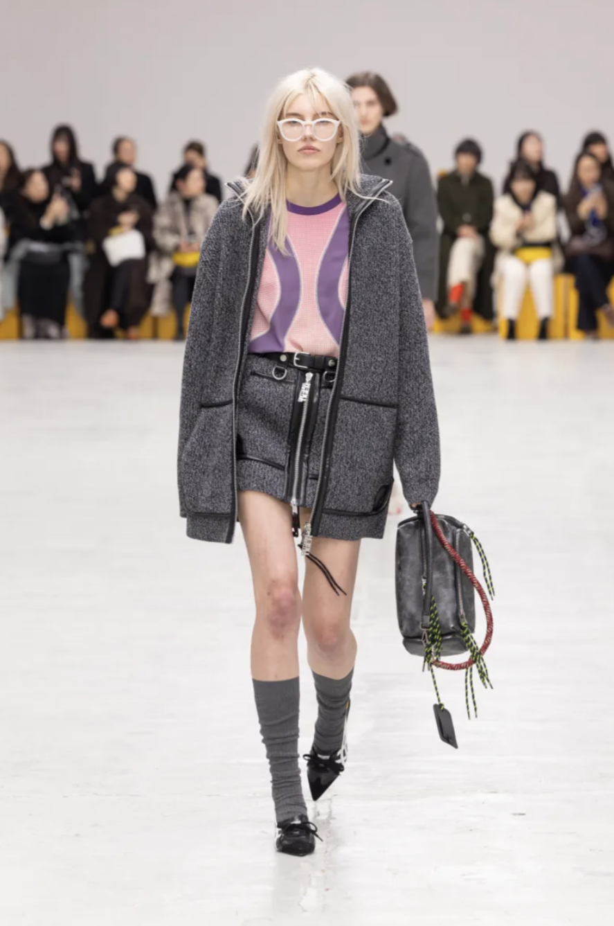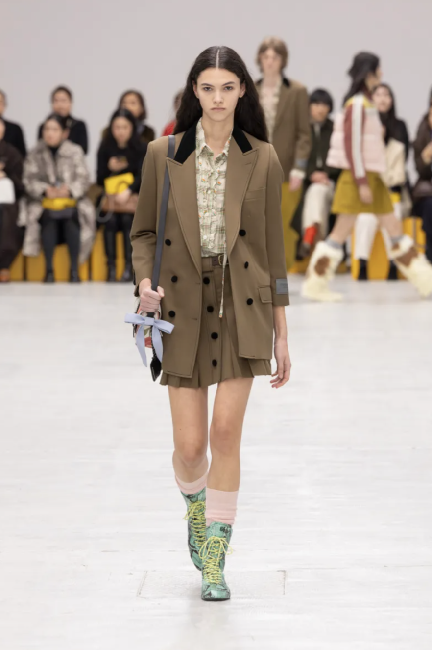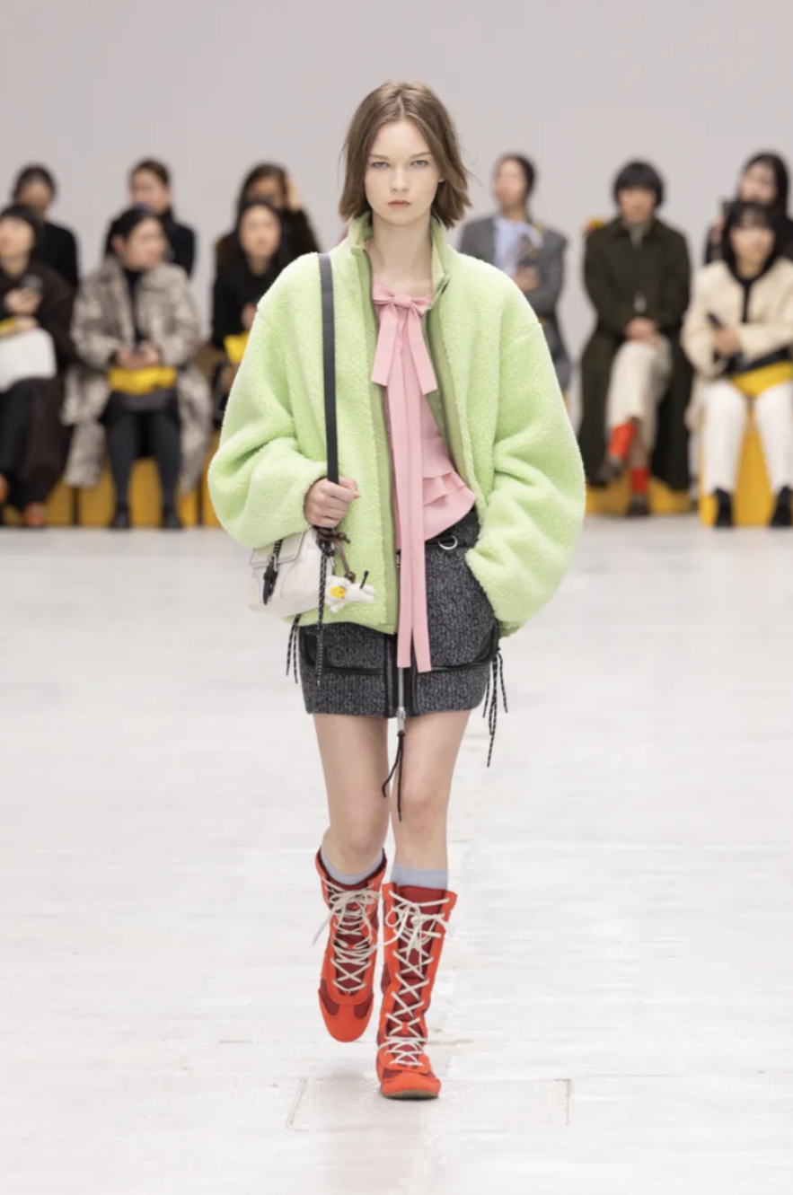Schoolgirl Lolitas, eccentric professors, and skater boys mingled on the catwalk, all dressed in clothes that balanced precision and play. Pleated miniskirts and cropped blazers were styled with ribbed socks and pointy-toed kitten-heeled versions of the iconic Mexico 66 sneakers. Ruffled georgette blouses, sailor stripes, and pastel dresses brought a dose of sugary nostalgia, while fuzzy fleeces, checked shirts, and feathered skirts grounded the lineup in texture and practicality. The collection also introduced the Mexico 66 Square sneaker in lizard prints and floral motifs, as well as slingback heels and studded crossbody bags adorned with charms shaped like bows, lipstick holders, and tiny tigers.