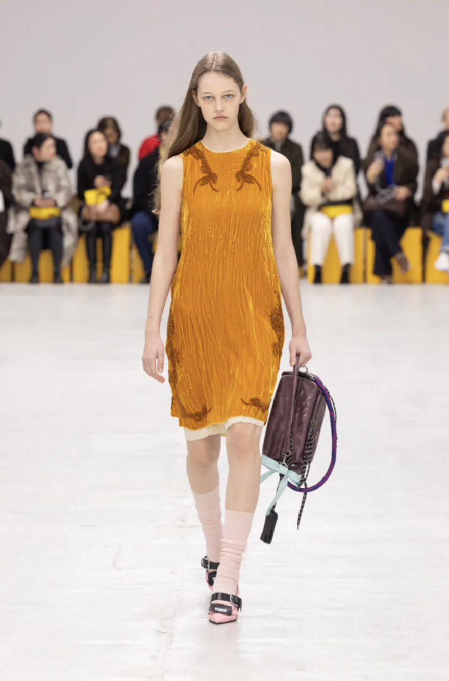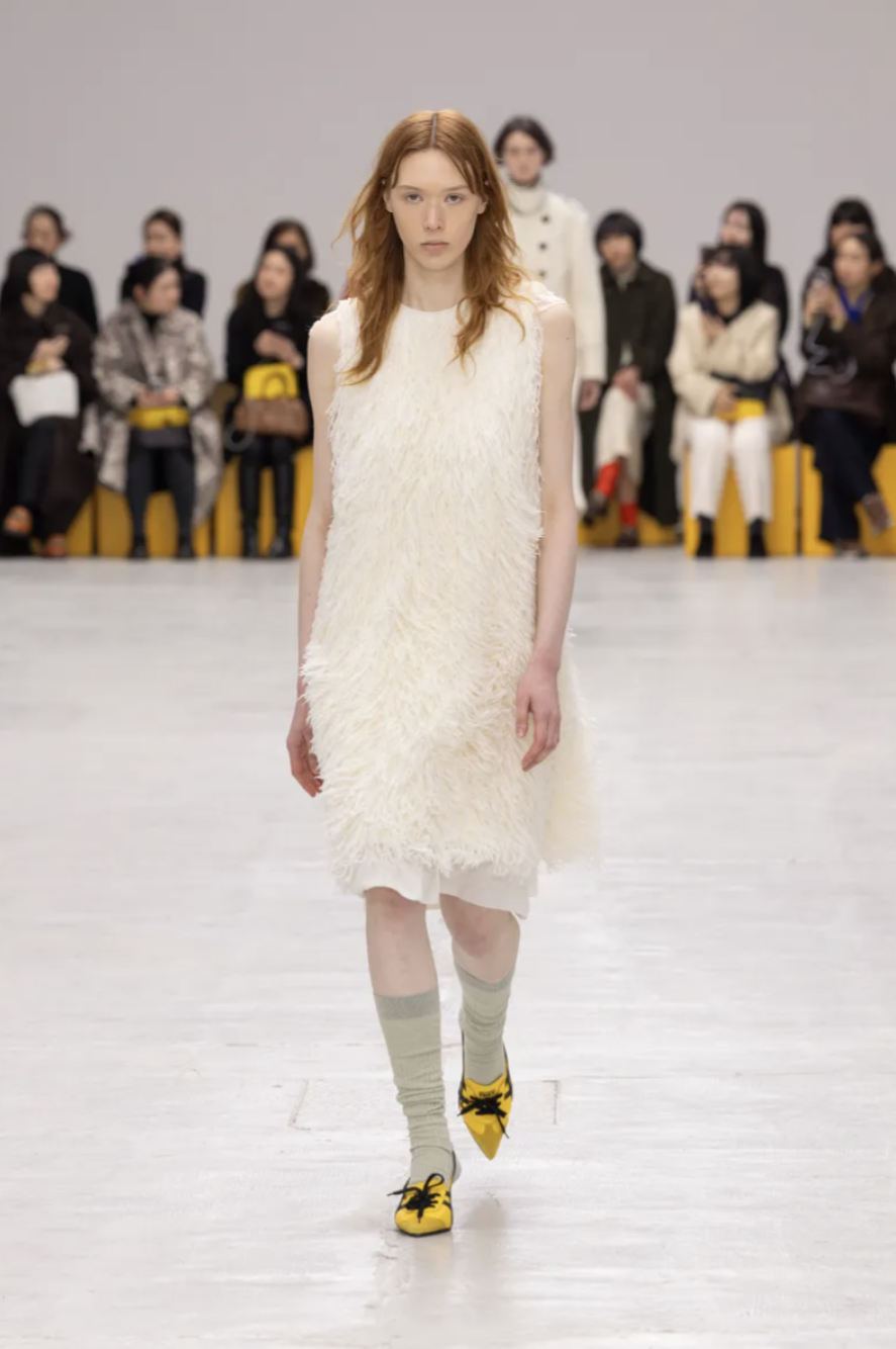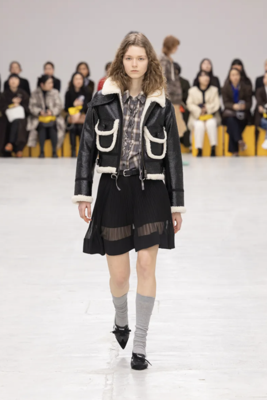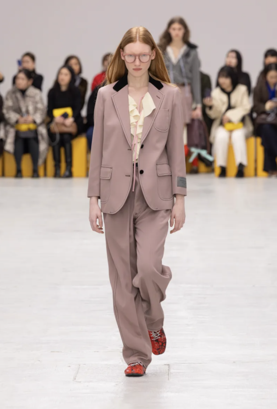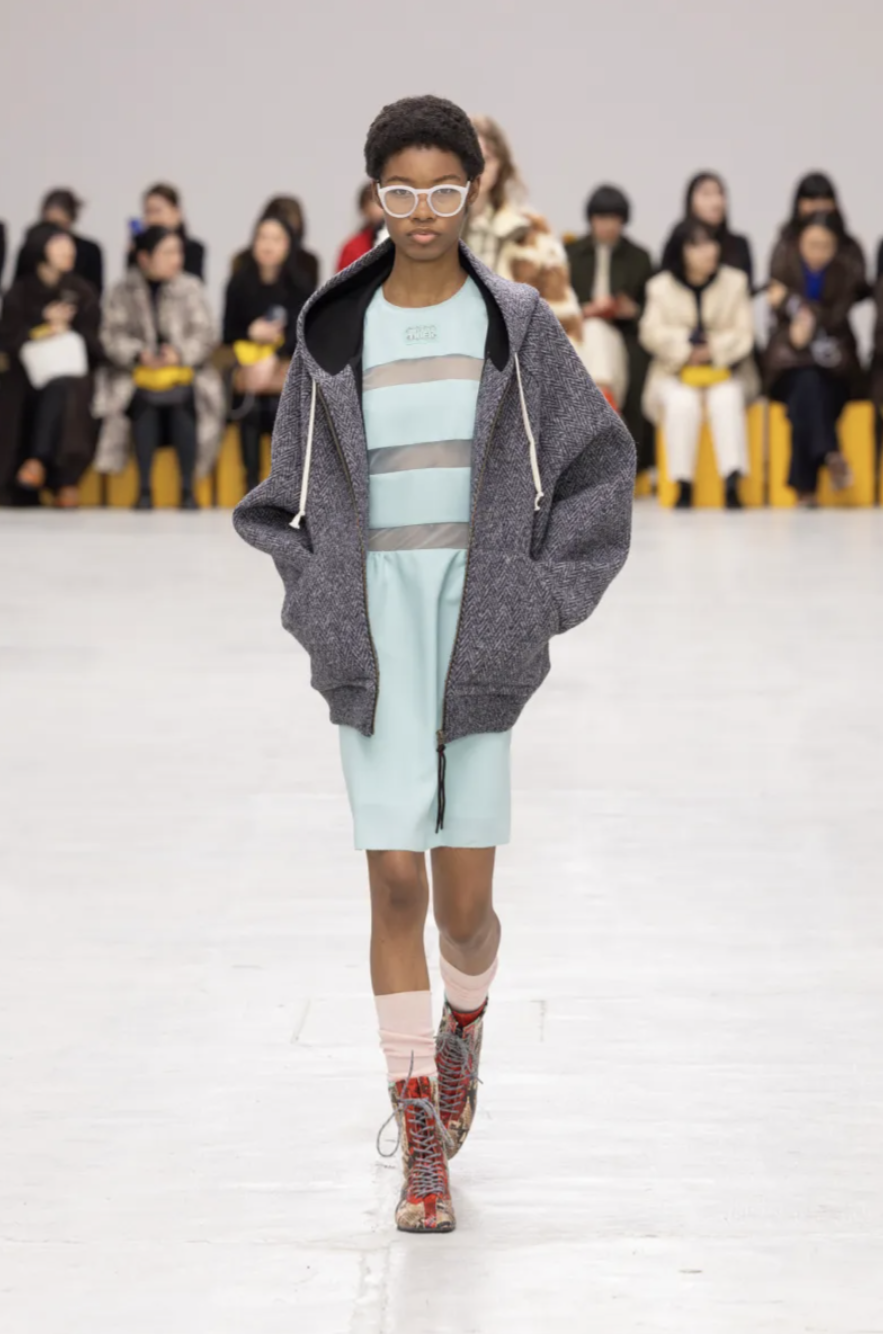 Schoolgirl Lolitas, eccentric professors, and skater boys mingled on the catwalk, all dressed in clothes that balanced precision and play. Pleated miniskirts and cropped blazers were styled with ribbed socks and pointy-toed kitten-heeled versions of the iconic Mexico 66 sneakers. Ruffled georgette blouses, sailor stripes, and pastel dresses brought a dose of sugary nostalgia, while fuzzy fleeces, checked shirts, and feathered skirts grounded the lineup in texture and practicality. The collection also introduced the Mexico 66 Square sneaker in lizard prints and floral motifs, as well as slingback heels and studded crossbody bags adorned with charms shaped like bows, lipstick holders, and tiny tigers.
