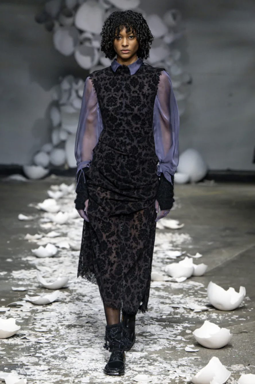 The collection itself felt like a spell cast through fabric. Soft alpaca tops trailed with strips of tulle that rippled behind the models like smoke. Layers of hand-knit tulle crisscrossed across bodies, creating patterns that looked almost alive when in motion. Dujancourt drew inspiration from the notion of female communes once outlawed in history, imagining what might have become of women like her — creators, dreamers, conspirators — born into a time that did not allow their freedom. That haunting question ran quietly beneath the show’s surface beauty, transforming each garment into an act of defiance.