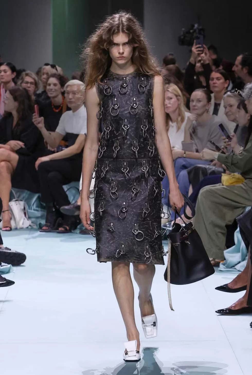 The collection balanced striking details with more understated elements. There were bold pieces like argyle sweaters with metal-adorned skirts and sundresses with exaggerated straps, but also simpler, modular items for more conservative tastes. Accessories, a signature of Prada, featured oversized sunglasses, hybrid visor hats, and metallic belts paired with low-rise looks. The reappearance of tights-as-pants suggested a potential shift in silhouettes, hinting at a change from the dominance of wide-leg trousers.