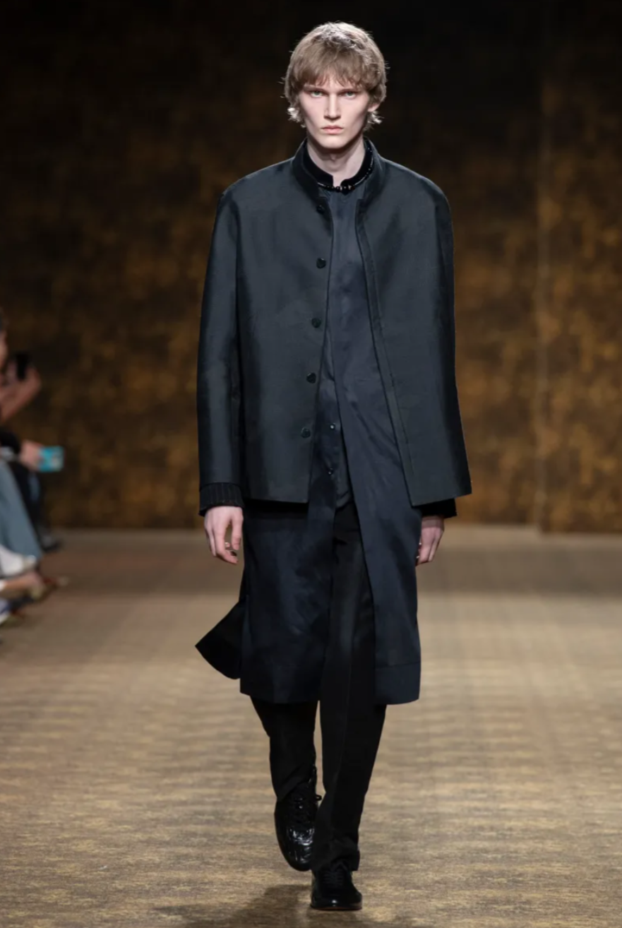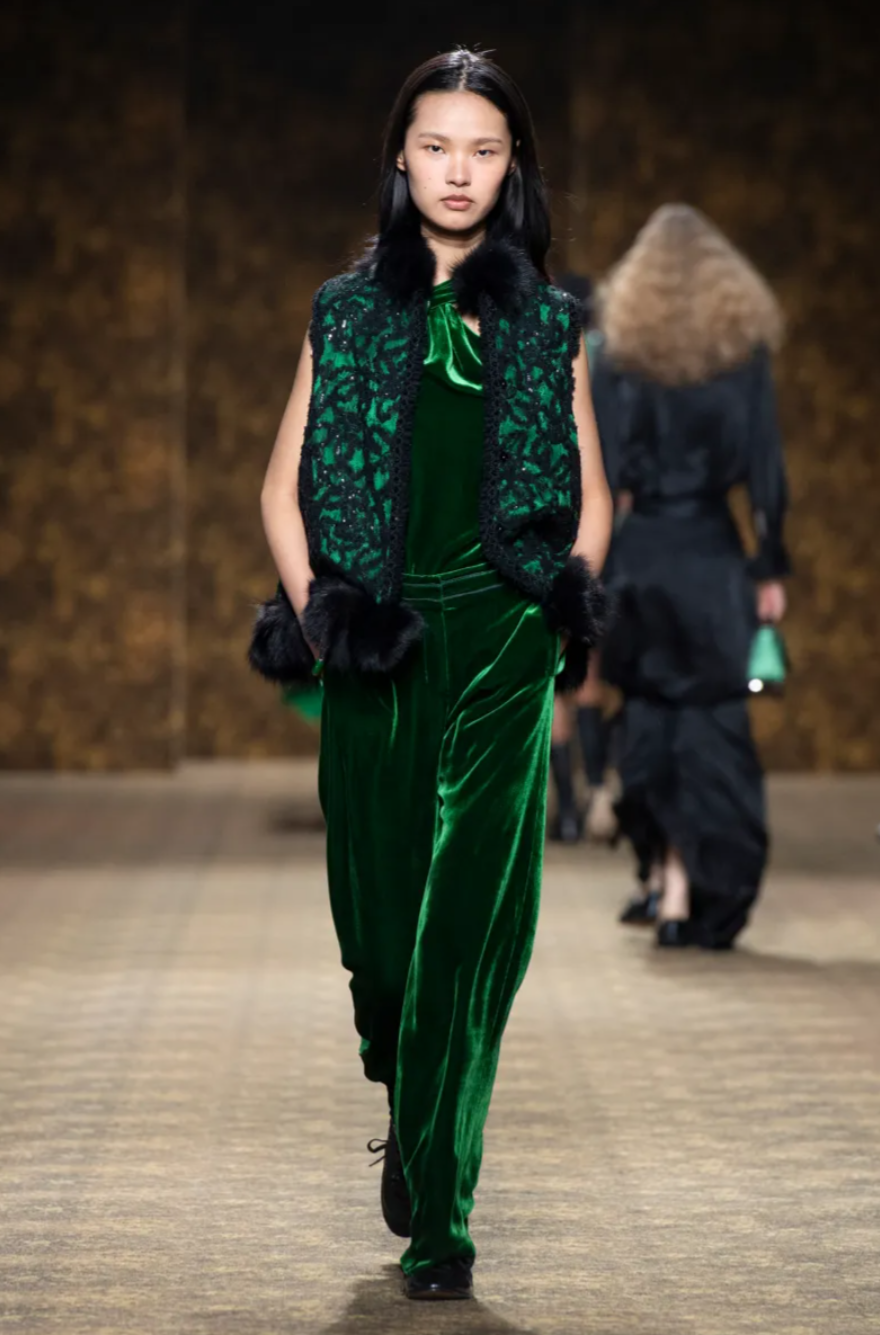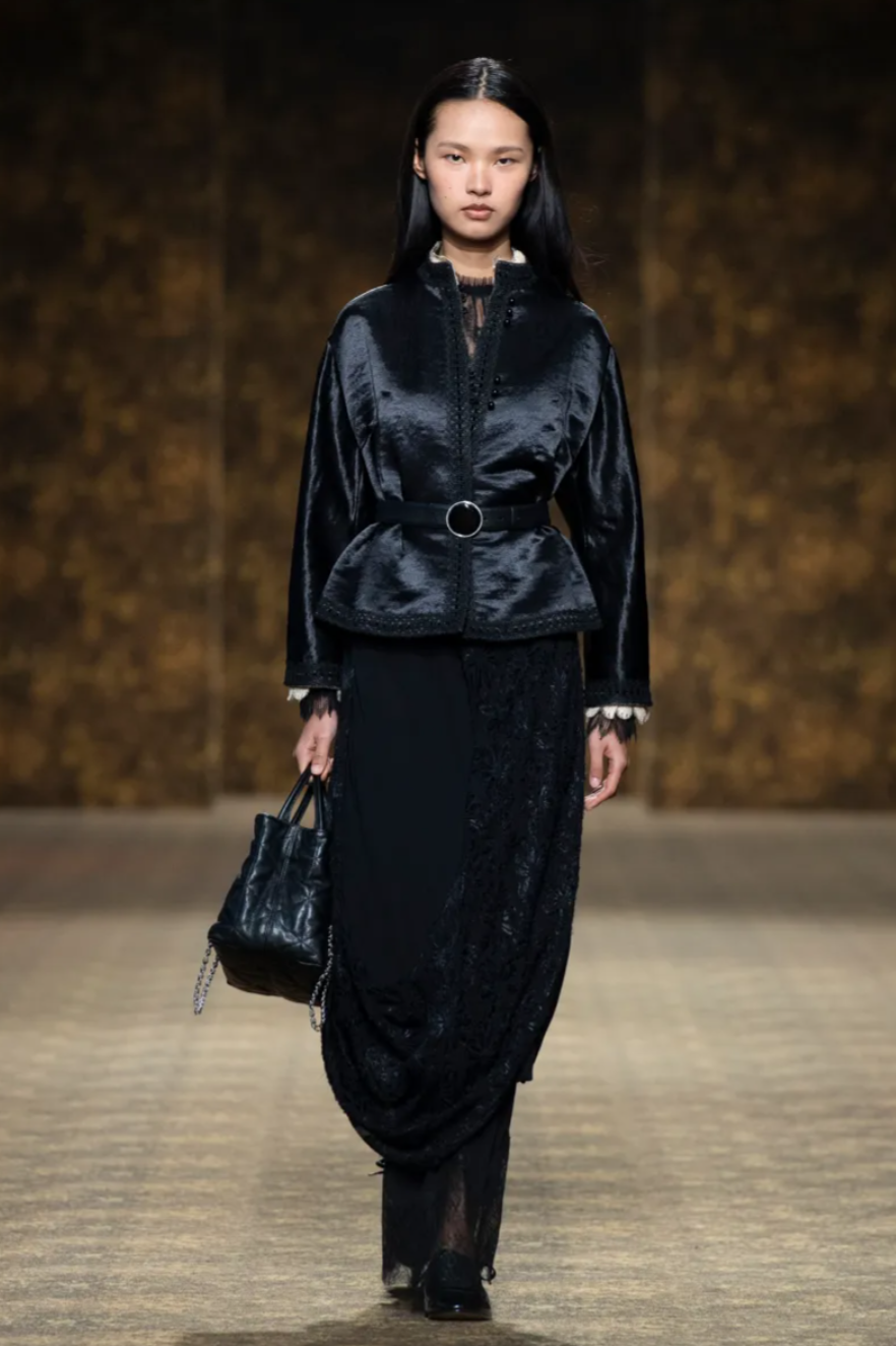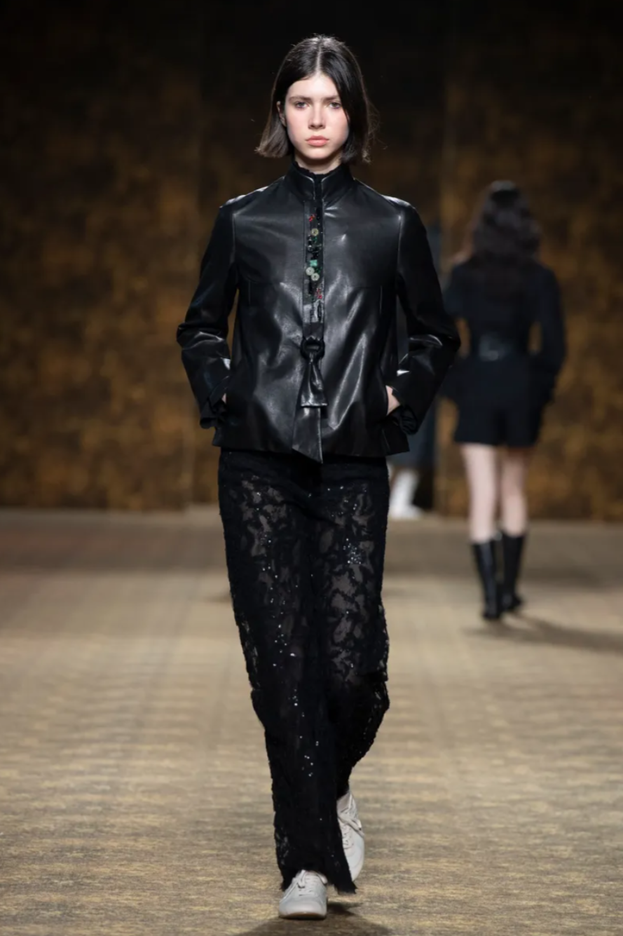 Colour played a central role in the Shiatzy Chen Fall 2026 collection, with shades of orange, jade green and gold evoking imperial richness. Softer combinations of white and green or white and red referenced the celebrated Jadeite Cabbage housed at the National Palace Museum. Jade itself appeared throughout the Shiatzy Chen Fall Winter 2026 lineup as both ornament and symbol, from delicate inlays on brushed denim to donut shaped buckles worn close to the body and jewellery pieces that could shift from necklace to brooch. The result was a Shiatzy Chen Fall 2026 collection that balanced historical opulence with a mineral like clarity, allowing the brand’s refined craftsmanship to shine.