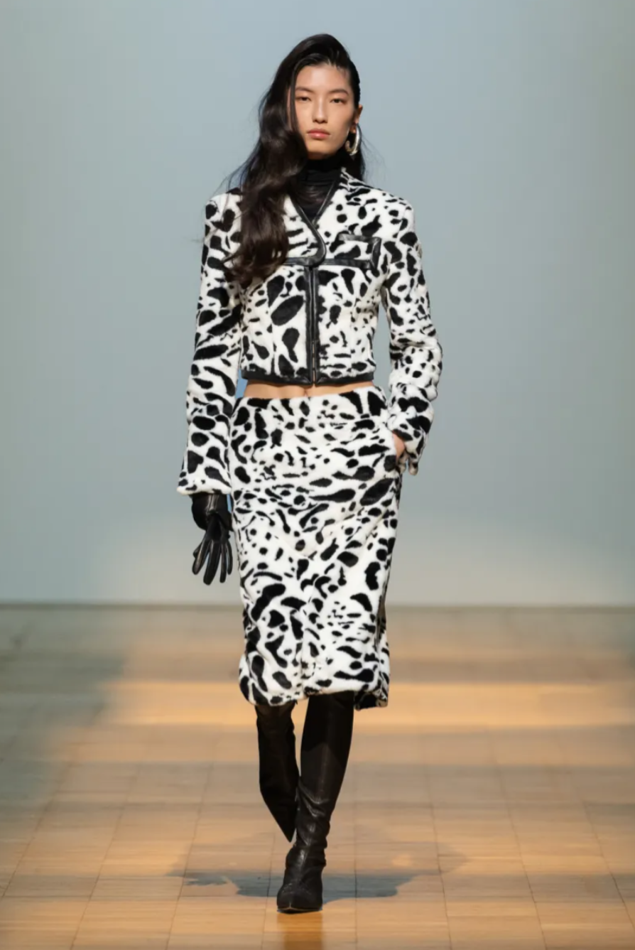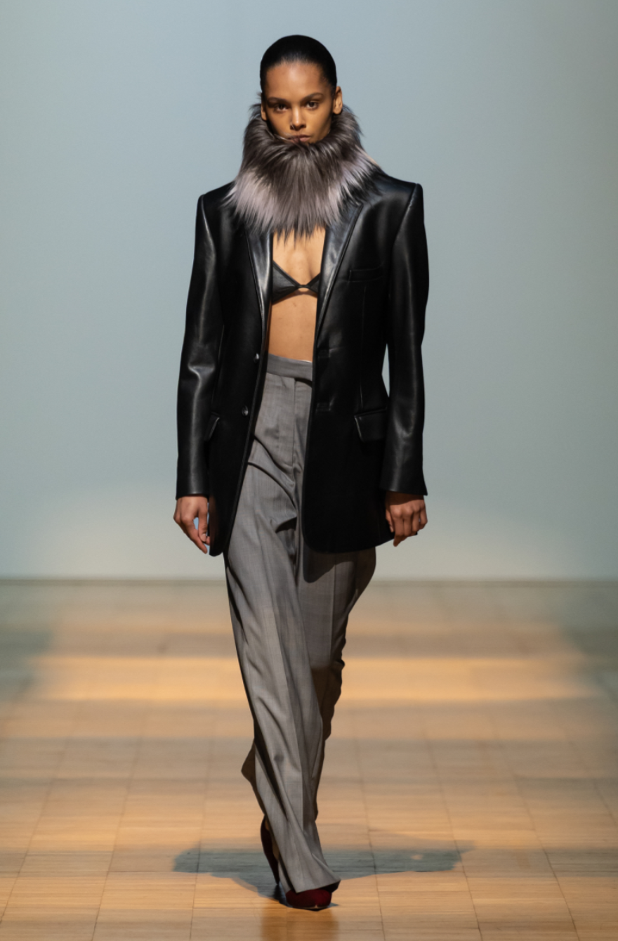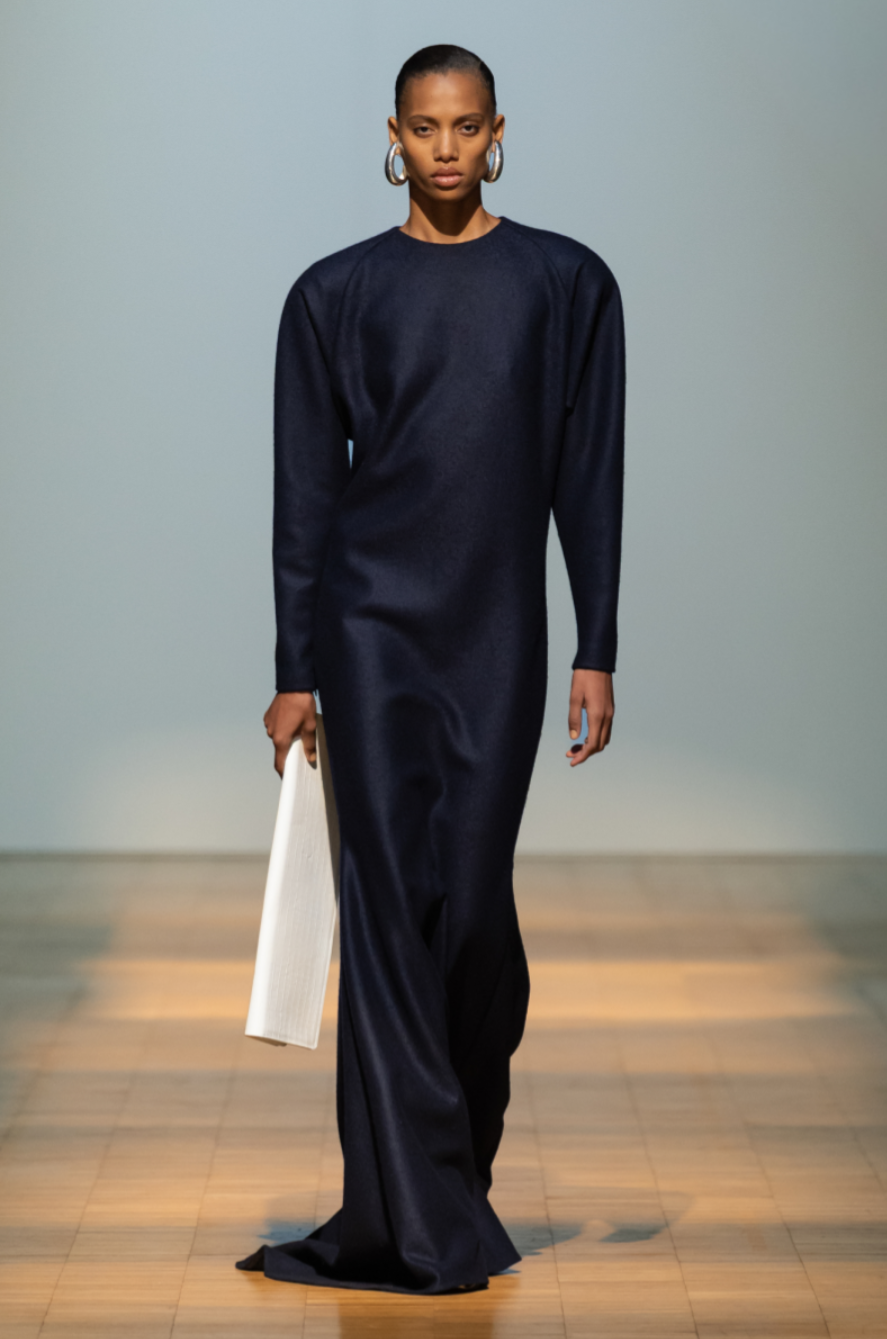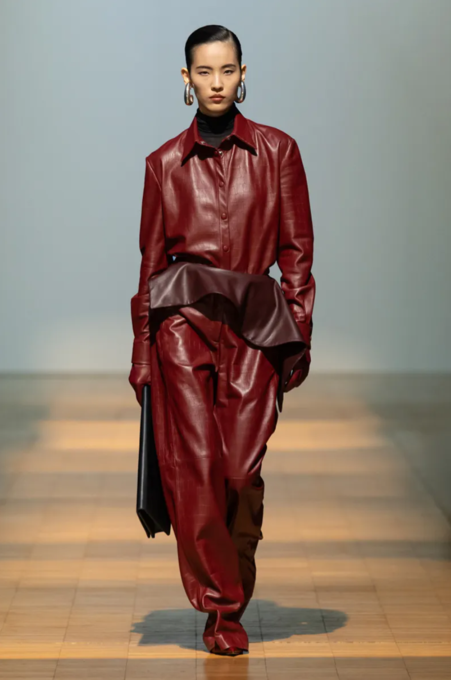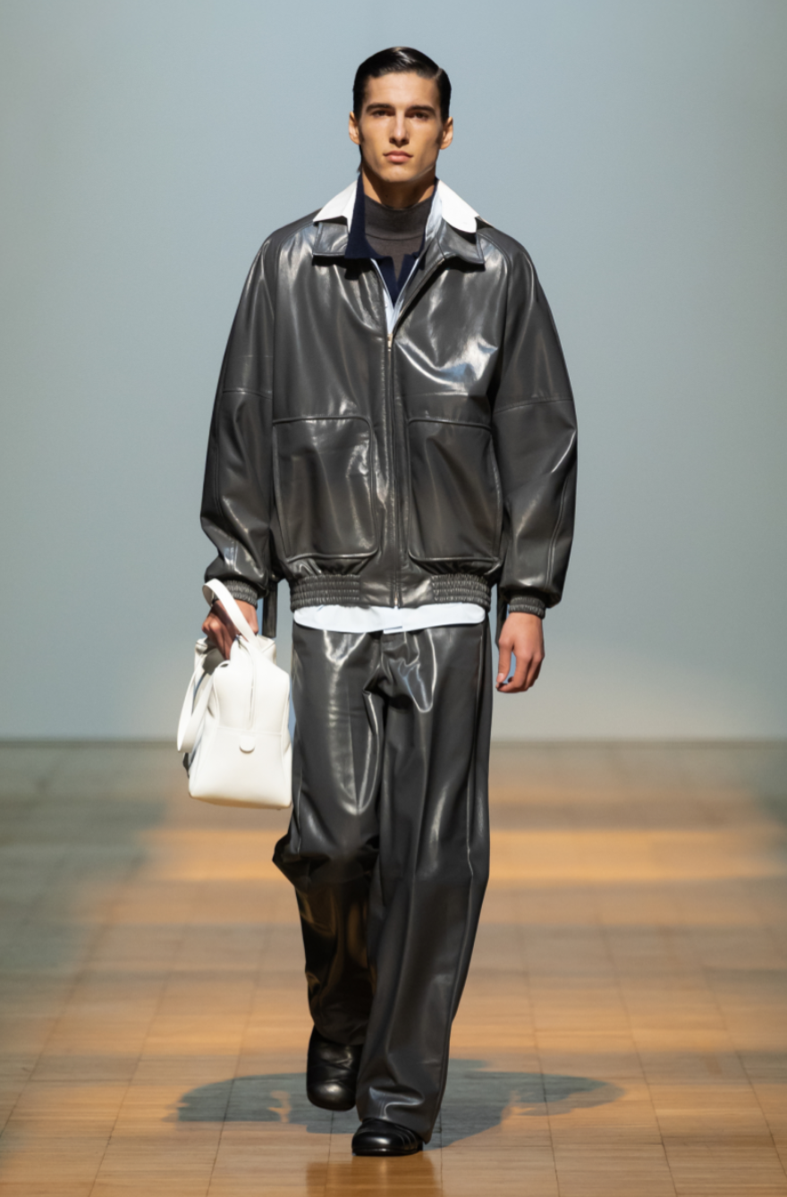The Situationist Fall 2026 show also expanded the label’s wardrobe beyond tailoring. A sleek heather grey jumpsuit demonstrated the designer’s attention to construction through trompe l’oeil seaming, while knitwear and accessories appeared more prominently. Bags, particularly oversized styles, suggested an emerging category within the Situationist Fall Winter 2026 collection. If the lineup occasionally felt expansive, it also reflected a designer using a milestone moment to showcase the full breadth of what Situationist can become in the decade ahead.