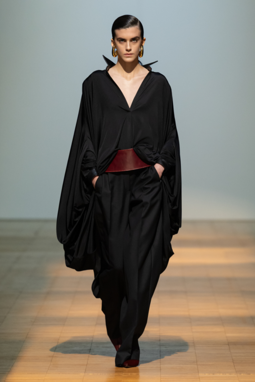 The Situationist Fall 2026 collection leaned into silhouettes that framed the shoulder line, creating a subtle cusp of the 1990s mood. Jackets and coats featured sculptural collars that wrapped around the shoulders like sails or curved gently along the neck in more restrained forms. In several pieces from the Situationist Fall Winter 2026 lineup, blazer lapels cascaded into dramatic folds while the backs revealed fully formed sleeves, an example of Rusadze’s technical play with proportion and structure. Throughout the collection, Situationist’s tailoring remained precise, with sharp trousers and straight midi skirts anchoring the looks.