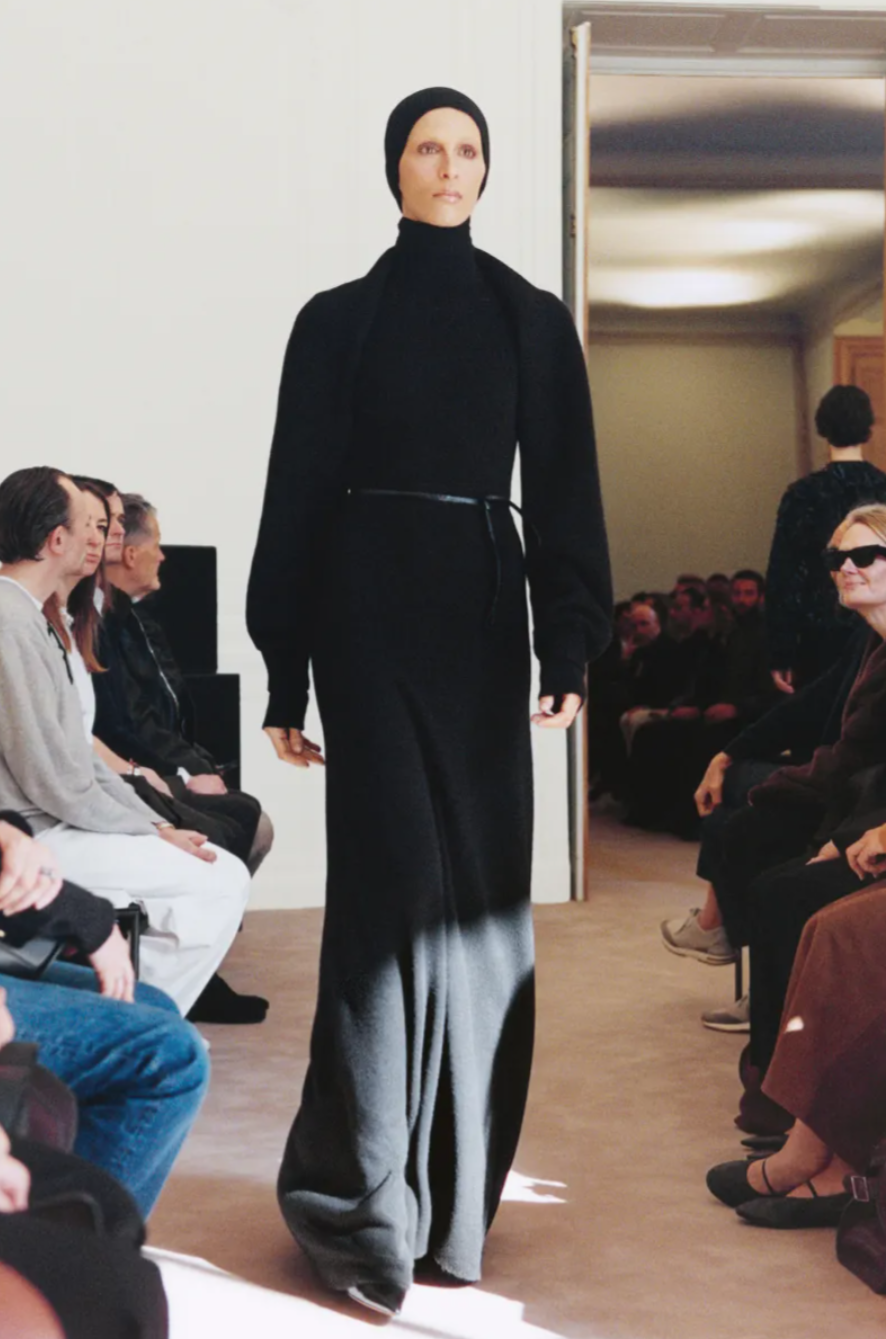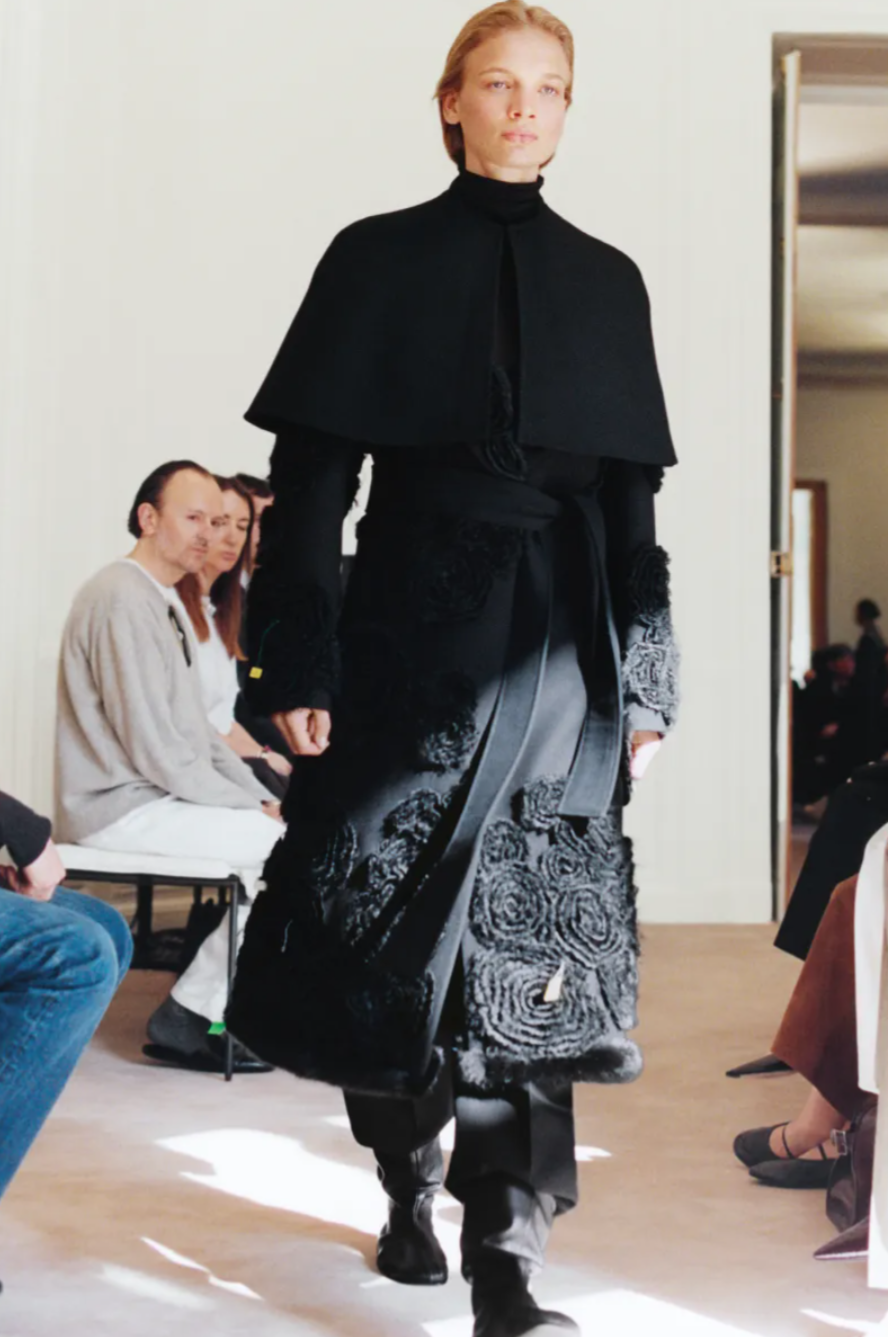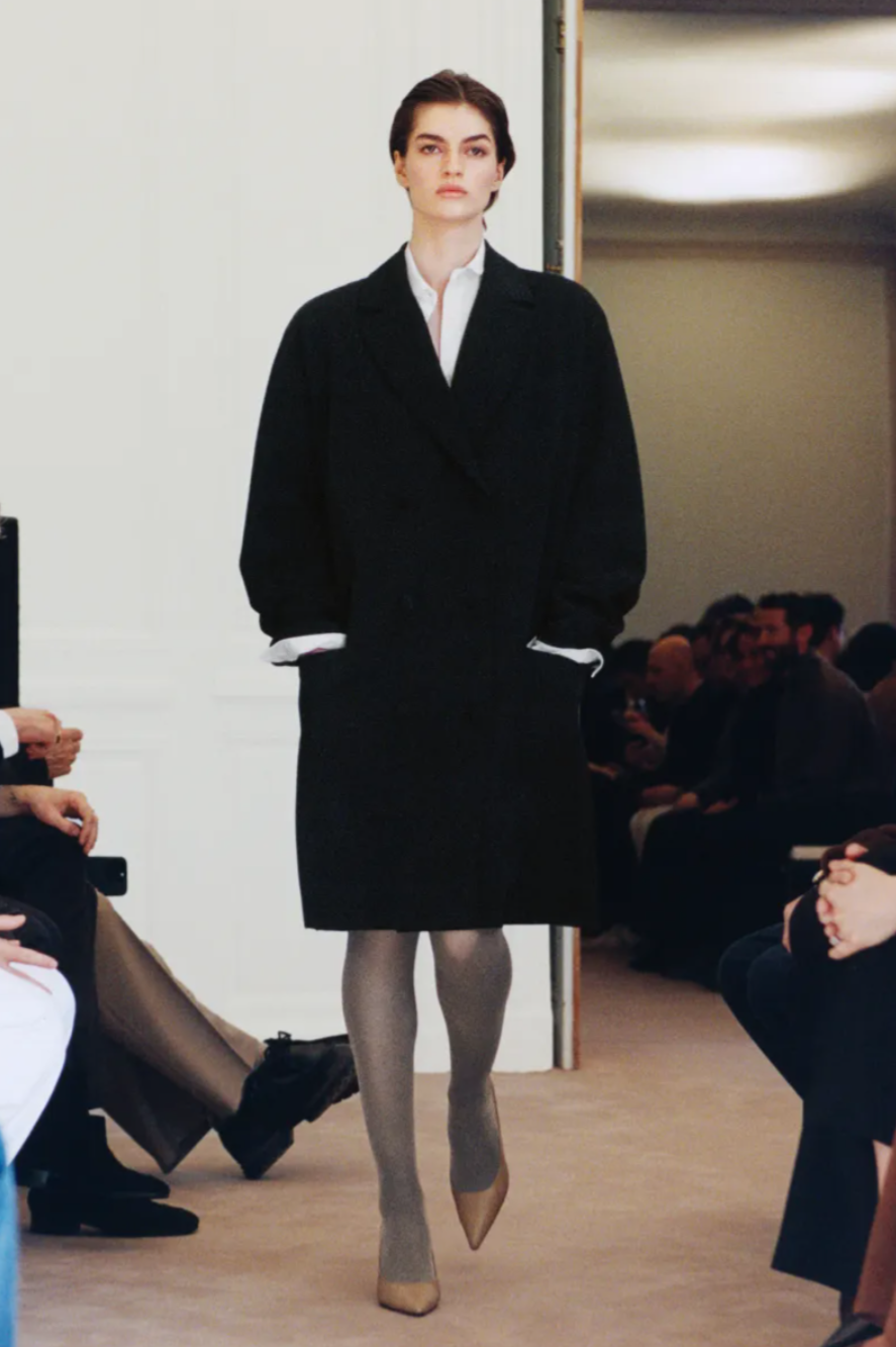 Texture also played a discreet yet deliberate role in the The Row Fall 2026 show. Following last season’s flirtation with maximalism, the designers refined their approach through quieter gestures such as feather trimmed collars, shredded velvet ribbons and fur edged pencil skirts. Accessories, as always, hinted at future cult favourites within the The Row Fall Winter 2026 collection. Polished point toe pumps paired with sheer black and grey tights brought a composed finish to many of the looks, while curved boat necklines framed the collarbone on minimalist dresses. In typical The Row fashion, the message was clear: modern elegance lies not in excess, but in silhouette, proportion and precision.