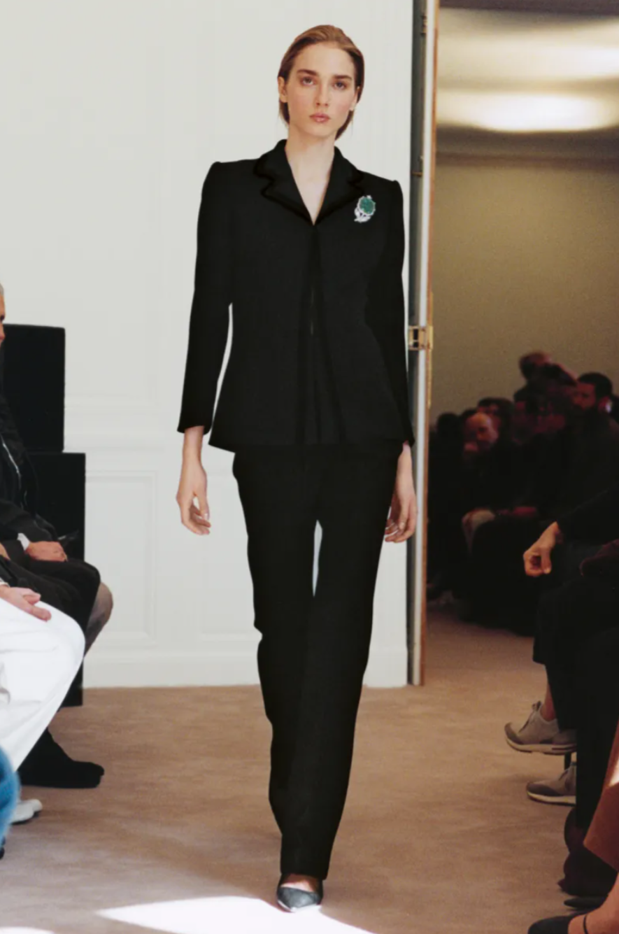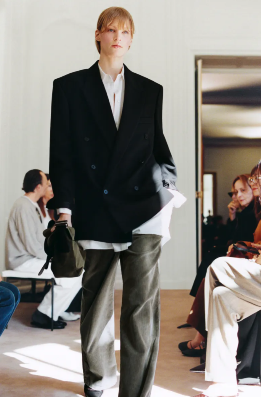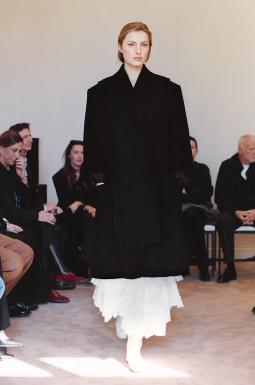 Texture also played a discreet yet deliberate role in the The Row Fall 2026 show. Following last season’s flirtation with maximalism, the designers refined their approach through quieter gestures such as feather trimmed collars, shredded velvet ribbons and fur edged pencil skirts. Accessories, as always, hinted at future cult favourites within the The Row Fall Winter 2026 collection. Polished point toe pumps paired with sheer black and grey tights brought a composed finish to many of the looks, while curved boat necklines framed the collarbone on minimalist dresses. In typical The Row fashion, the message was clear: modern elegance lies not in excess, but in silhouette, proportion and precision.