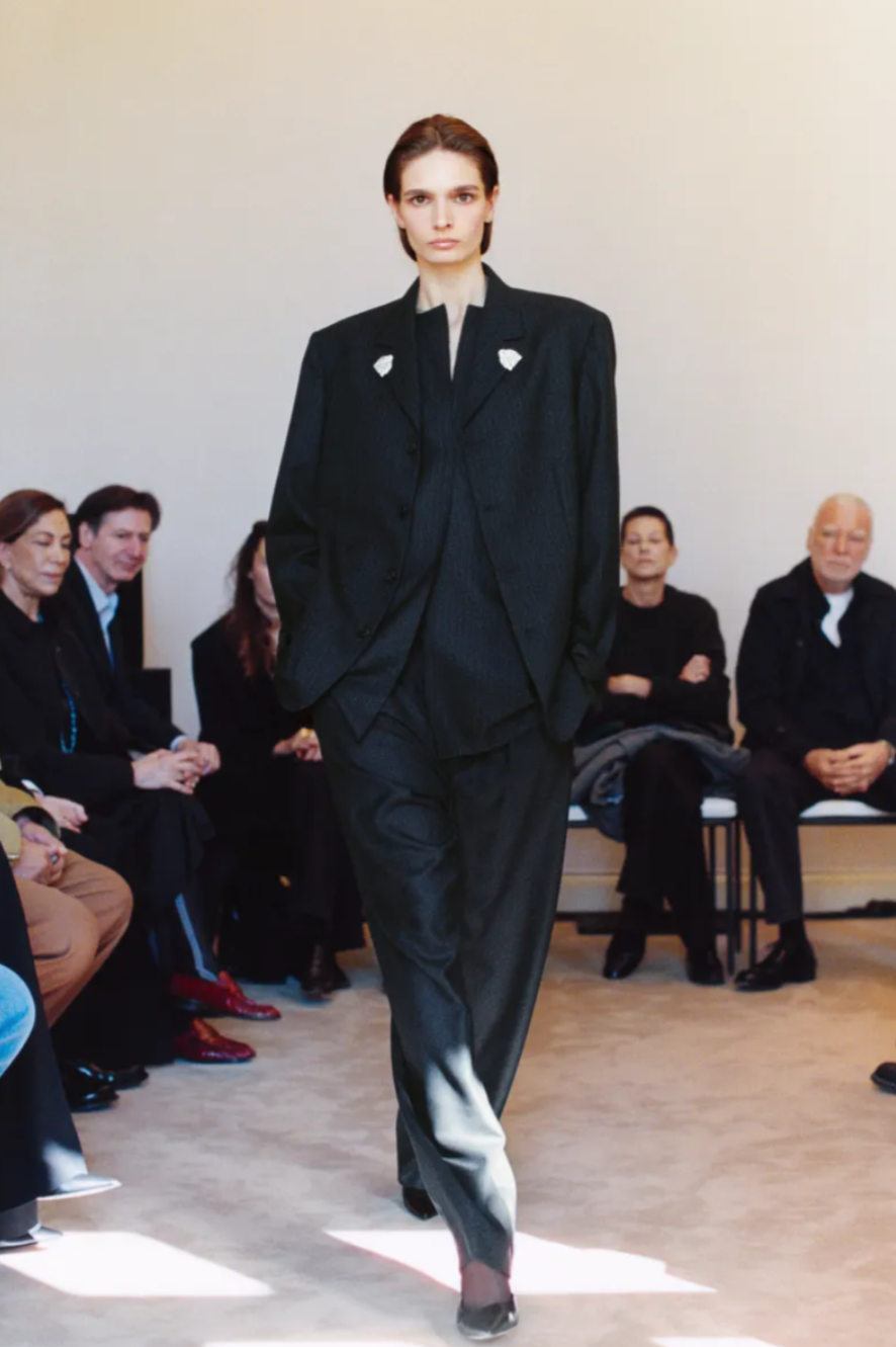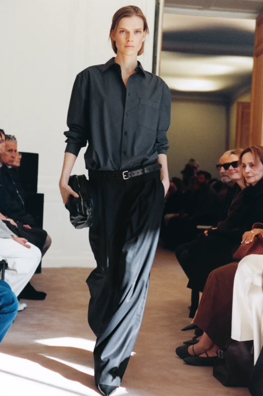 The The Row Fall 2026 collection continued the label’s ongoing dialogue between restraint and craftsmanship. Workhorse wardrobe staples sat comfortably beside pieces that hinted at couture level construction, reflecting the quiet luxury that has defined The Row’s influence over the past decade. This season introduced a subtle shift in silhouette. The slouchy relaxed tailoring long associated with The Row gave way to slimmer cuts, with cigarette trousers and shrunken jackets suggesting a return to the precise lines of the late 1990s. Throughout the The Row Fall Winter 2026 collection, sheer layering became a key styling language, with organza tops placed over poplin tunics and pearl necklaces glimpsed beneath translucent turtlenecks.