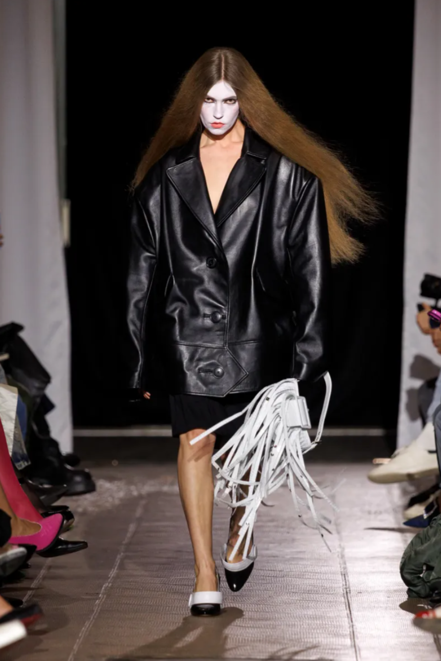 The result was an explosion of audacity and humour. There were assless skirts, topless tops and fluorescent feathered merkins, each piece designed with the gleeful conviction that taste is subjective and rules are optional. “We got too caught up in thinking about what people wanted and not what we wanted,” DiCaprio said backstage, before adding that this might, paradoxically, be their most commercial collection yet. Their logic was simple: if they love it, their audience will too. Against a backdrop of organ music segueing into the Jaws theme, models stalked the aisle in hooded capes, boxy peacoats, bow skirts and what the duo dubbed “pillowcase tops.” A tongue-in-cheek “sunglasses bra” made an appearance, as did a series of leather looks softened with fringe, all balancing absurdity and sensuality in equal measure.