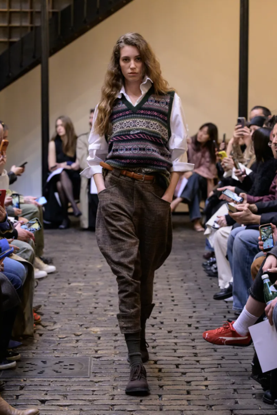 The collection also reflected Carmel’s fascination with place and identity. “It’s not universal, and it’s not digital,” he explained. “It’s not global in the contemporary meaning. It is like nationalism without a nation, almost.” That ethos manifested in Vautrait garments that combined structure with narrative detail. Wide-shouldered grey checked blazers were paired with trousers cinched at the ankles, layered over crisp white shirts and emerald sweaters. Woollen outerwear wrapped the body in asymmetric swirls, while vests embroidered with landscapes and cable-knit turtlenecks added texture and intimacy.