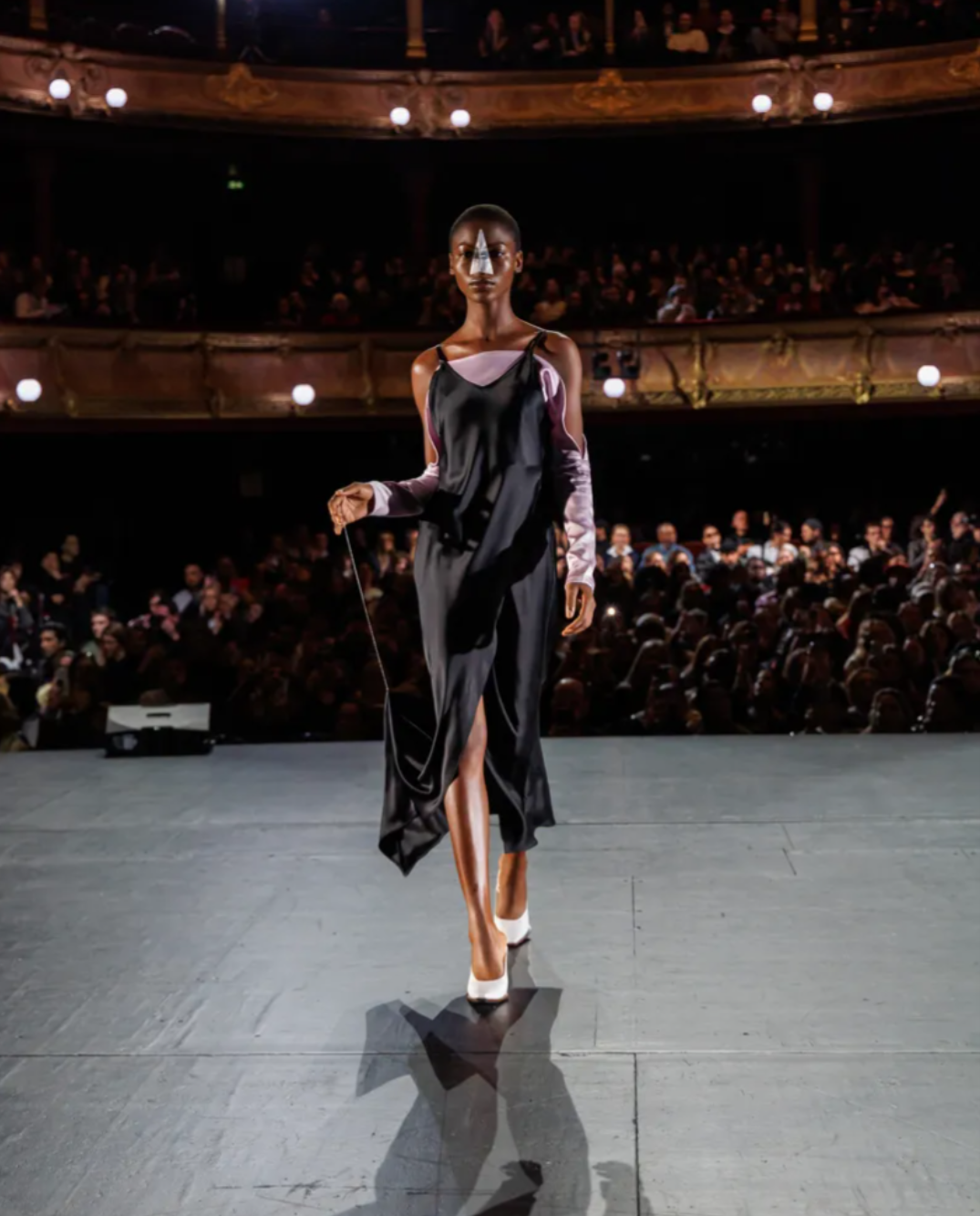 At Zomer, reality came with a wink. “We didn’t really think about doing a big show and now all of a sudden, it’s our biggest one,” said cofounder Danial Aitouganov, moments before taking over the Théâtre du Châtelet. The venue’s 2,000 seats were filled not only with editors and buyers but also with a new kind of front row: fans invited by content creator Lyas to attend the first-ever Watch Party held inside a live fashion show. The crowd erupted as audience members appeared kiss-cam style on a giant screen, an amusingly meta reflection of the brand’s ongoing commitment to accessibility and community.